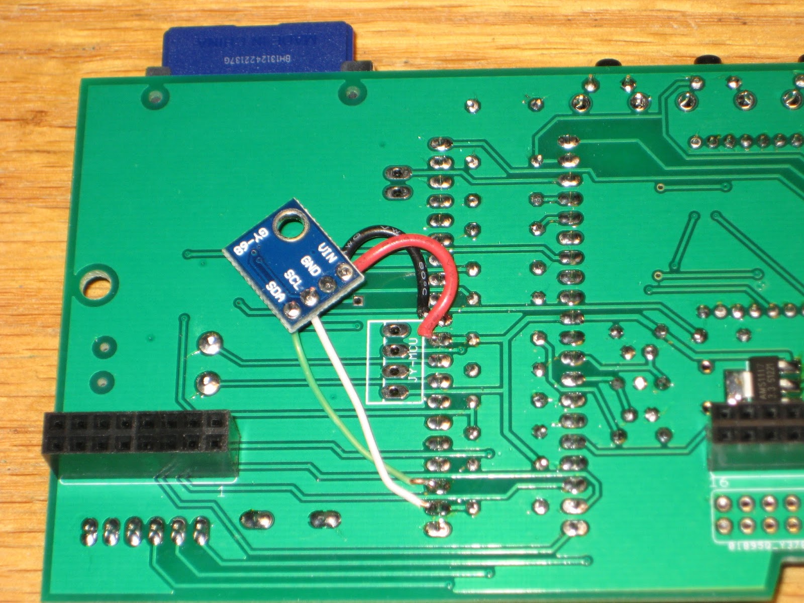 Connecting the barometer to Wise Clock 4 is trivial: I soldered wires directly to processor pins (SDA, SCL, VCC and GND), as shown in the photo. There is plenty of clearance between the board and the display.