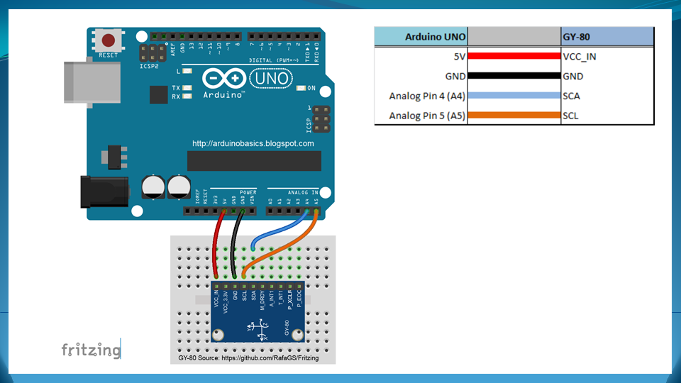 You can communicate with any of the sensors on the GY-80 module using I2C. The HMC5883L magnetometer sensor is no different. You will need four connections between the Arduino UNO and the GY-80 module. Have a look at the diagram below for the connection diagram and table.