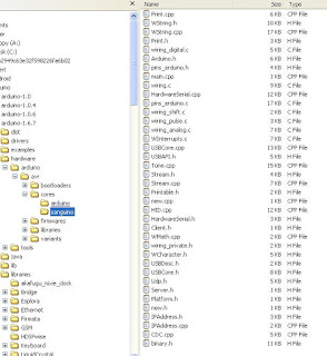 Next, as specified in the line "atmega1284.build.core=sanguino", we need to create the folder "sanguino", containing the core files. Folder structure should look like this:
