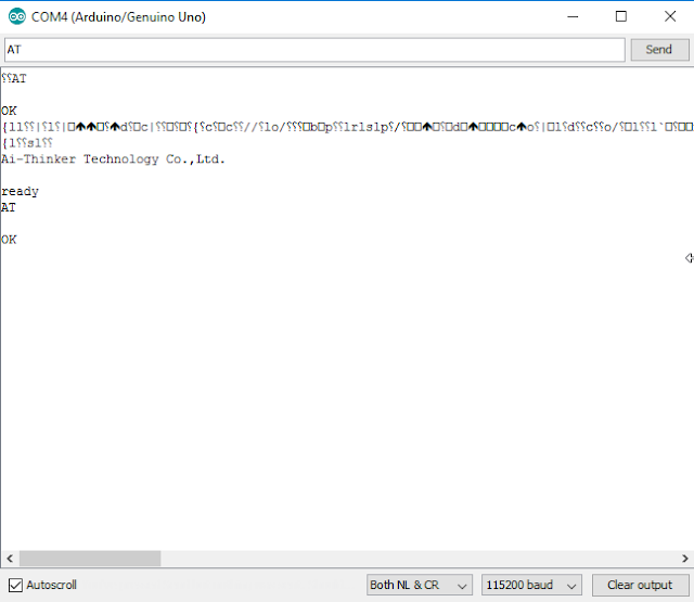 - You may see some garbled information come through, but you should see "Ai-Thinker Technology Co.,Ltd" and "ready" messages in the debug window.