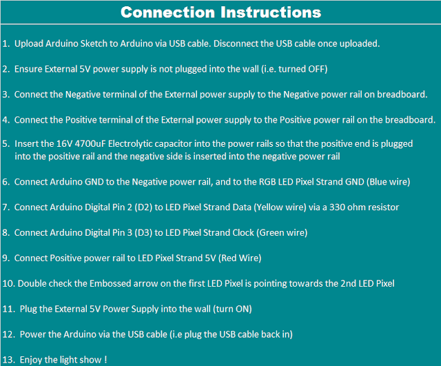 Adafruit also recommend the use of a large capacitor across the + and - terminals of the LED strip to "prevent the initial onrush of current from damaging the pixels". Adafruit recommends a capacitor that is 1000uF, 6.3V or higher. I used a 4700uF 16V Electrolytic Capacitor.