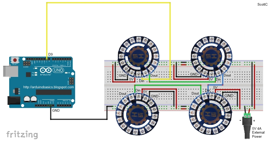Connecting FOUR LED Ring to the Arduino- (Click to enlarge)
