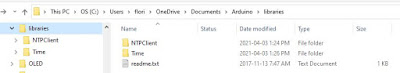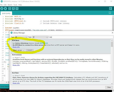 - open the sketch, then modify the SPI pins (I used DIN=33, CLK=12, CS=13, RST=27, all on the same side of the ESP32 dev module); got compilation error "Library not found" for both NTPClient and TimeLib;