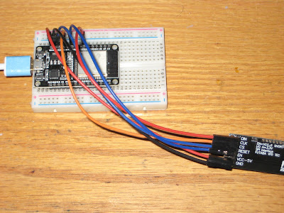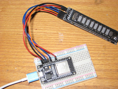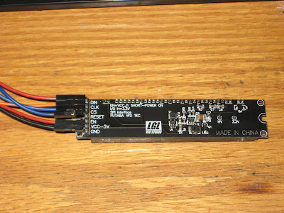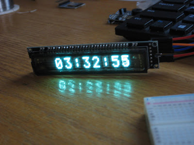 Compared to the HDSP-2534 LED display, the characters in the VFD module are about 50% bigger, and much brighter, making it readable from a greater distance. The current consumption is in the range 100-200mA, versus about 20mA taken by the HDSP display.