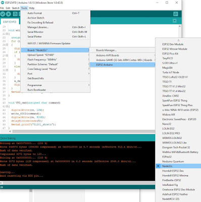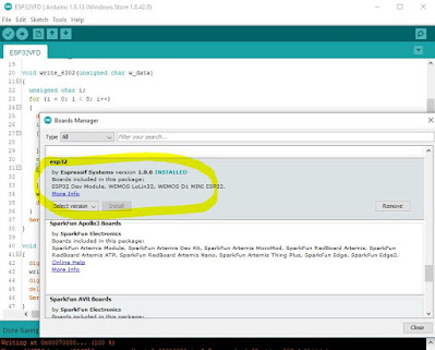 According to the PCB silkscreen, the VFD module is powered by 5V, but the signals are 3V3. (The 30V required by the VFD glass itself is made by the on-board switching mode power supply, so no need to worry about generating high voltage externally.) An ESP32 board would be the perfect candidate to control this display. Luckily, the found sketch was also written for ESP32, so all I had to do was compile and upload using Arduino IDE 1.8.13. The only problem was that my IDE installation did not show ESP32 boards anymore, even though I used it once previously. Therefore, I had to re-visit the whole setup process once again. This time I am documenting it, to save on any future effort. So here are the steps: