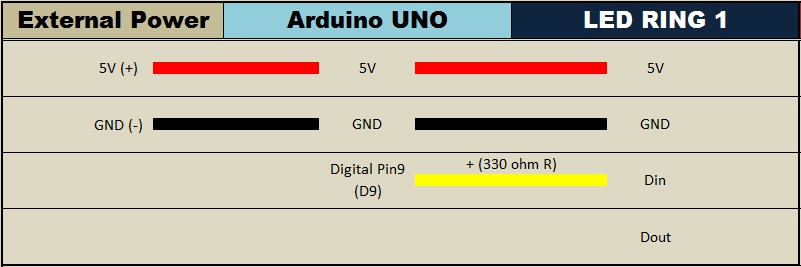 Adafruit is to place a "300 to 500 Ohm resistor" between the Arduino's data pin and the data input on the first NeoPixel to prevent voltage spikes that can damage the first pixel. I used a 330 Ohm resistor.