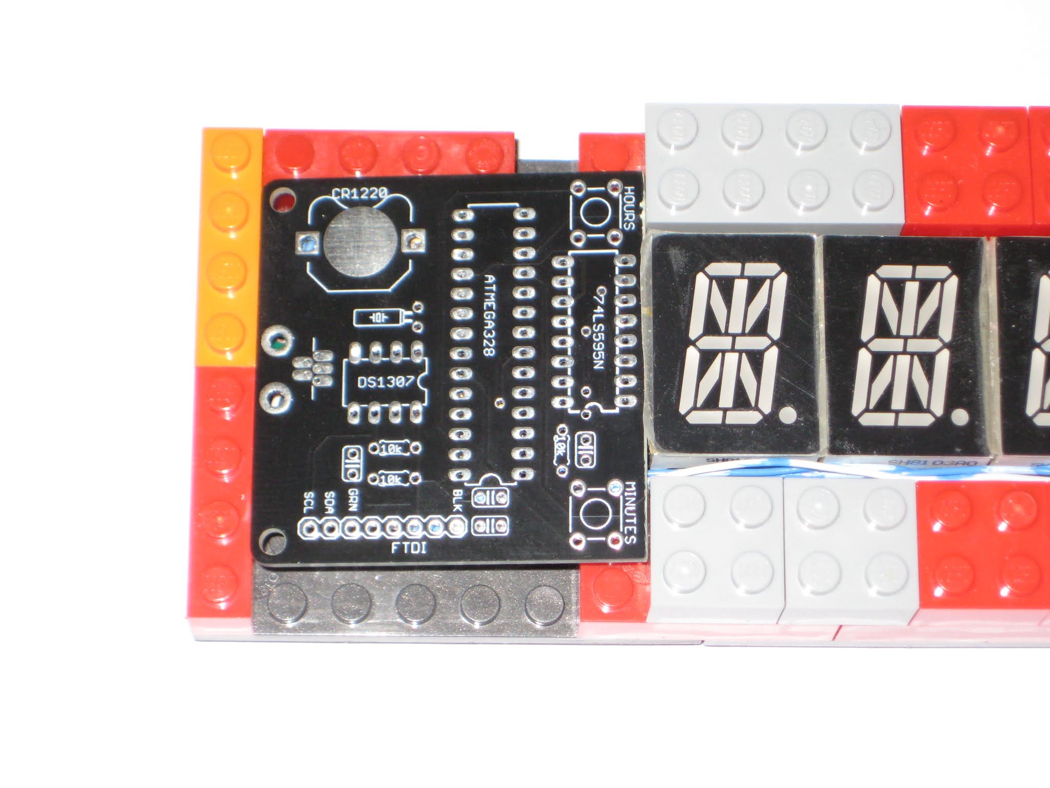 Hardware-wise, some re-wiring is required on the HDSP board, starting with the removal of the 595 shift register. Then, D3, D4 and D5 (ATmega328 pins 5, 6, 11) must be connected respectively to SDCLK, LOAD and DATA pins (1, 2, 27) of the SCD5583 display.