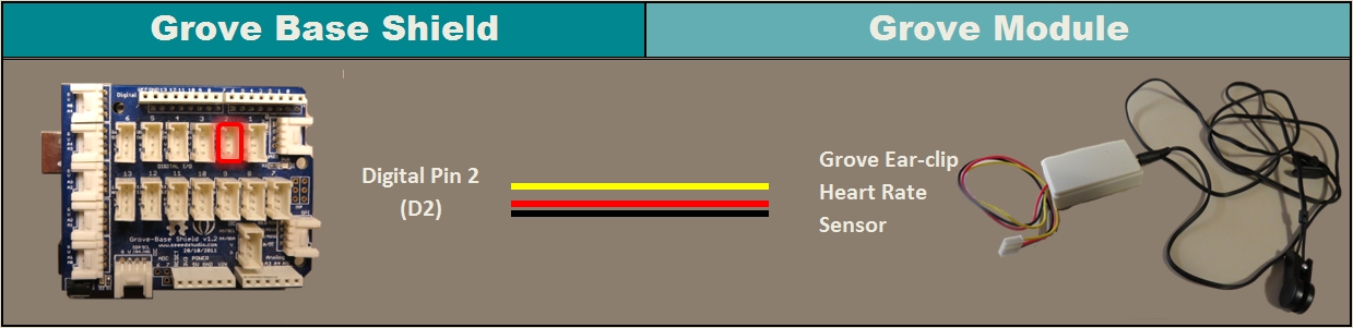 The Grove Base shield makes it easy to connect Grove modules to the Arduino. If you have a Grove Base shield, you will need to connect the Ear-clip heart rate sensor to Digital pin 2 as per the diagram below.Completed construction