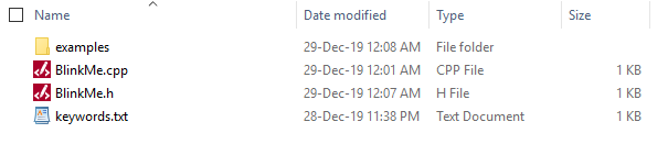 I will tell you what you need to write inside each of these files, but make sure you have the blank BlinkMe.cpp, BlinkMe.h and keywords.txt files inside of the BlinkMe folder. Some people start by creating the header file first, but I personally like to start with the CPP file.