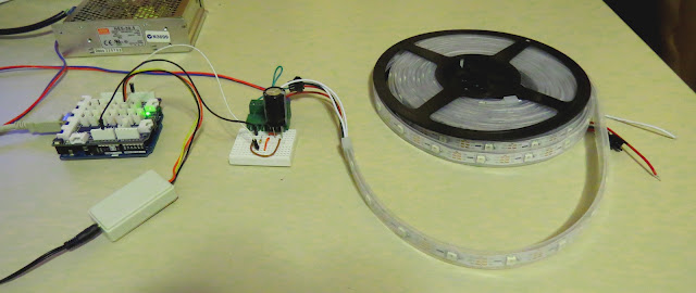 Adafruit also recommend the use of a large capacitor across the + and - terminals of the LED strip to "prevent the initial onrush of current from damaging the pixels". Adafruit recommends a capacitor that is 1000uF, 6.3V or higher. I used a 4700uF 16V Electrolytic Capacitor.