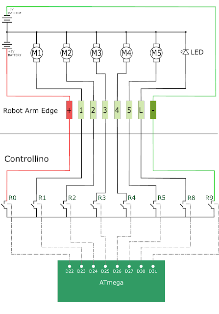 The following circuit diagram will show you how the OWI Robotic Arm will be controlled by the relays of the Controllino. This is the circuit diagram of the OWI robotic arm when it is connected to the Controllino.