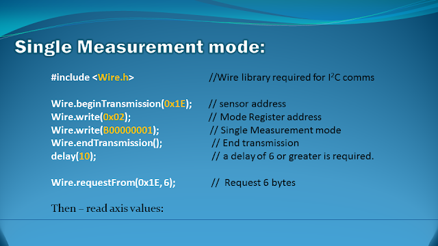 The getReadings function was created to easily retrieve the magnetometer axis data. I chose to use Single measurement mode in this tutorial.