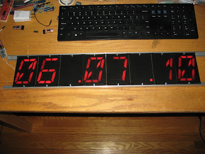 The biggest challenge was mechanical, particularly, finding a way to mount the 8 individual displays. Let me explain. I received the displays as ready-to-use (assembled, programmed and tested) products. I did not expected to dis-assemble them (not even partially) in order to mount them. The two mounting methods described in the documentation (using 15mm and 20mm profiles, respectively) ask for just that, basically to cut the original plastic rivets and, eventually, to replace them with (your own) M3 screws when fixing them to the rails. (I actually started going along with either described method until I realized I did not want to open them up). The easiest solution I found in the end was to use 1/2" x 1/2" L-profile, as shown below. For this, I only cut the middle rivets and used the holes to screw each individual display to the rails.
