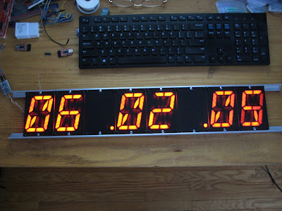 In the world of 16-segment displays, Klais-16 is the biggest I have seen, at about 8cm (3") character height. Multiple displays can be daisy-chained and controlled through serial communication (1 pin, TX). It is open source and available to buy on Tindie at the very reasonable price of US$15 a piece.