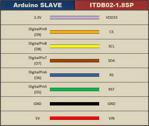 Arduino SLAVE ITDB02-1.8SP TFT 3.3V ---- VDD33 Digital9 (D9)---- CS Digital8 (D8)---- SCL Digital7 (D7)---- SDA Digital6 (D6)---- RS Digital5 (D5)---- RST GND ---- GND 5V ---- VIN