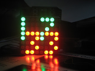 The sketch, written for my 8x8 bi-color LED matrix shield (also used in the original glass-domed Wise Clock) can be downloaded from here. It should be easy to adapt it to any other RG 8x8 LED matrix. The code also features setting up the clock using two buttons.