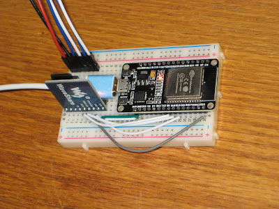 Using the ESP32 devkit is as easy as the first Arduino (Duemilanove). The only thing one needs is a solderless breadboard, which I was lucky to have one around, since I don't remember ever using one before. An interesting fact is that the ESP32 board, inserted in the breadboard I have, leaves room for connecting wires only on one side.
