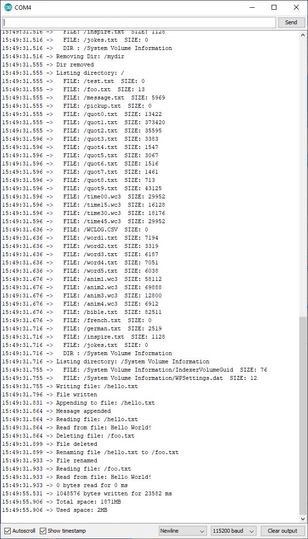 Running SD_Test.ino sketch example coming with ESP32 libraries on a Wise Clock 4 SD card, this is what serial monitor shows: